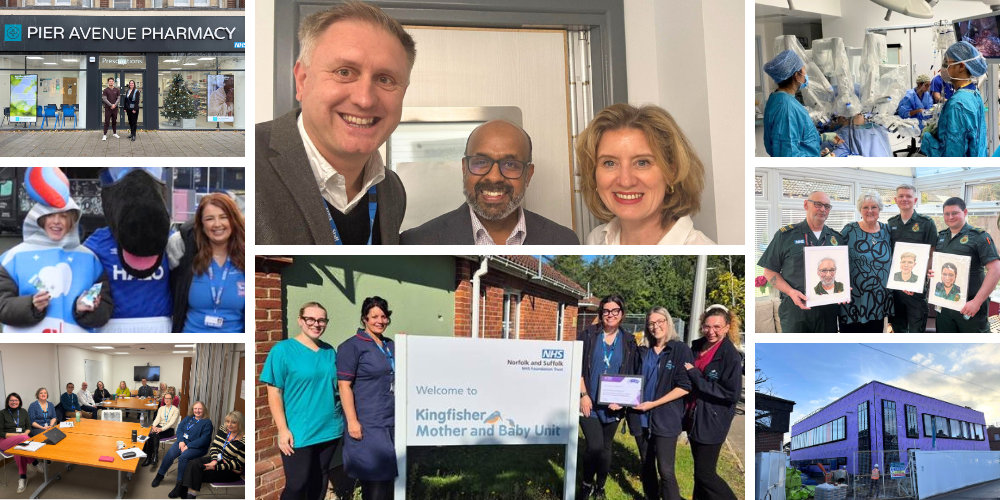 From top to bottom, left to right: Junchao Jiang and Dr Georgina Marsh outside G.M Graham Pharmacy in Clacton, SHINE Dental Promotion, ICB Seasonal School Session, Ed with Dr Maneesh Prasad, MD of Mental Health ED in Basildon and Dr Frankie Swords, Hellesdon Hospital’s Kingfisher Mother and Baby Unit, NNUH Robotic Assisted Minimally Invasive Oesophagctomy, EEAST Staff Portrait Presentation, The new UTC being built at Clacton Hospital