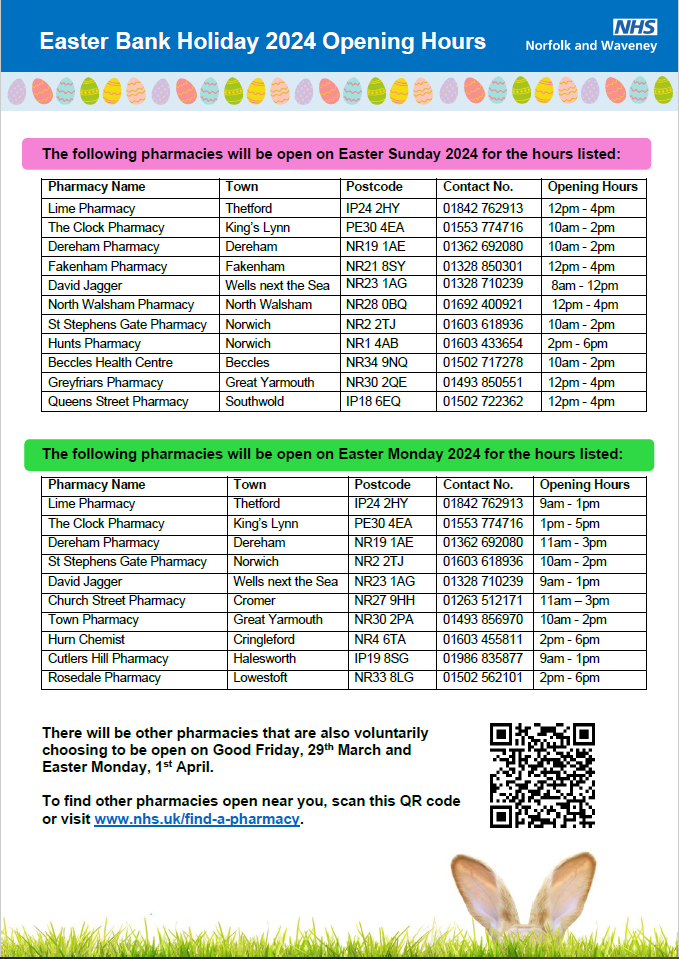 NHS Norfolk and Waveney has commissioned several community pharmacies to be open during the upcoming Easter bank holidays across Norfolk and Waveney.